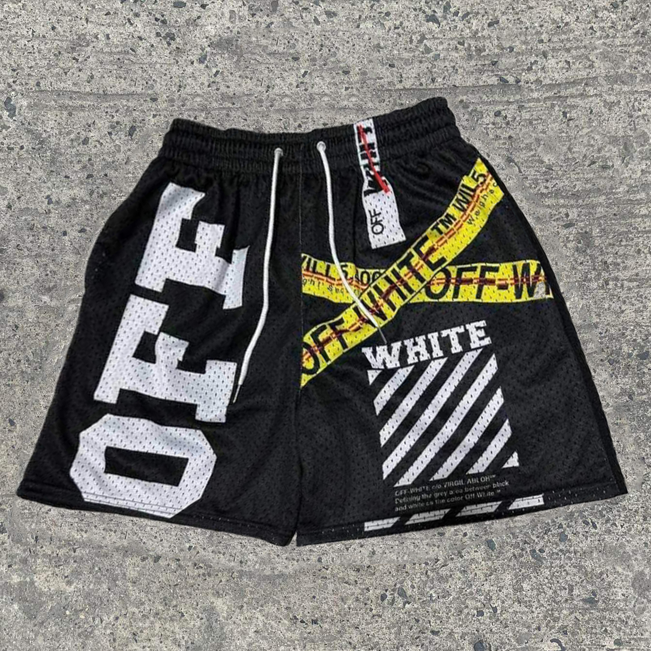 Anime print black and white patchwork mesh shorts
