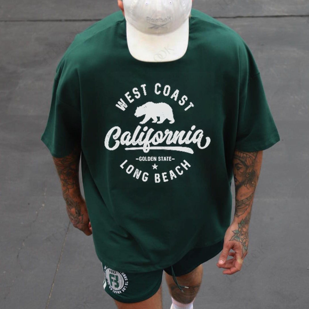 Men California Long Beach Bear Print Short Sleeve T-Shirt