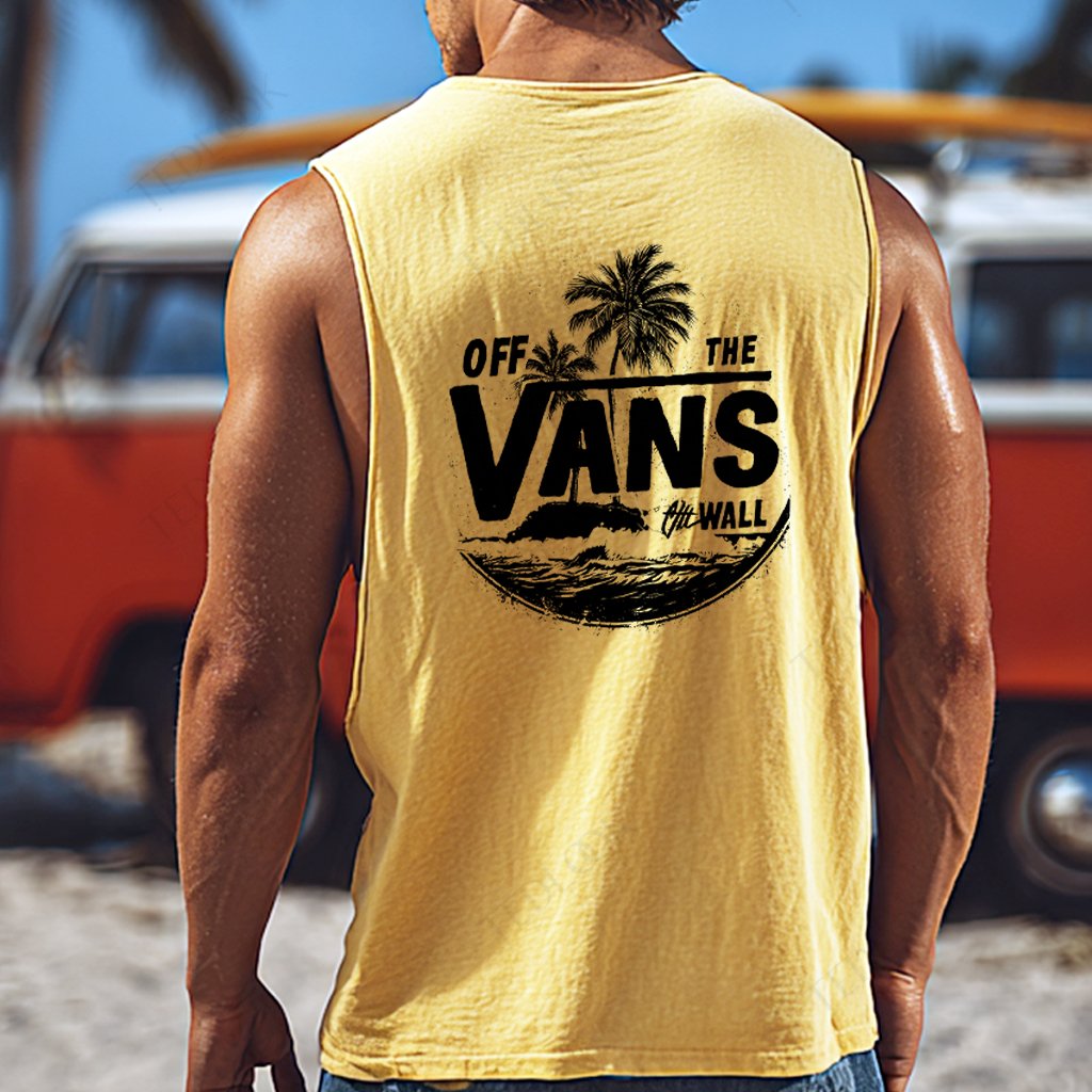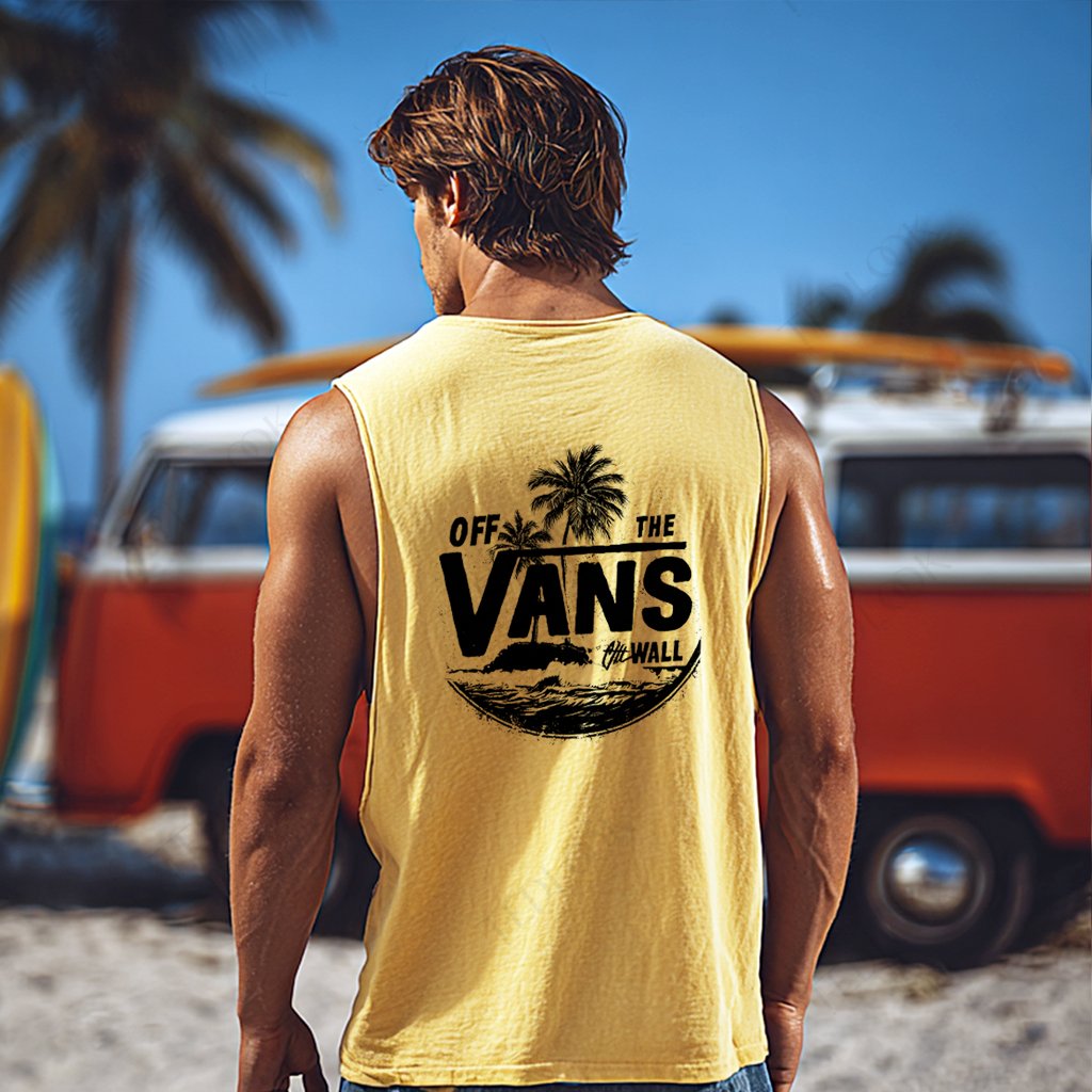 • Design Elements: Tropical palm tree graphic, wave illustration, bold lettering