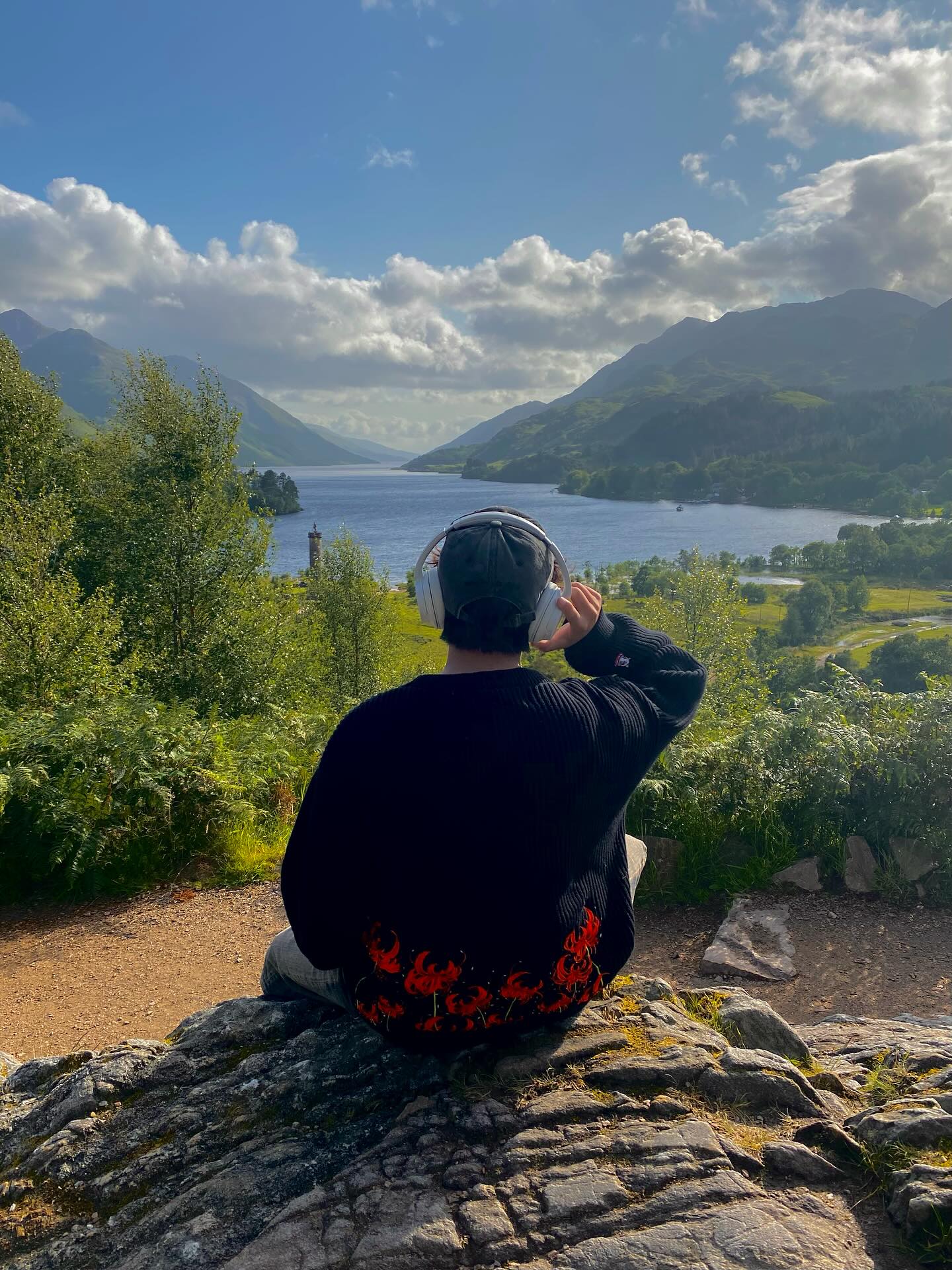 - Bold red floral embroidery pops on deep black knit.